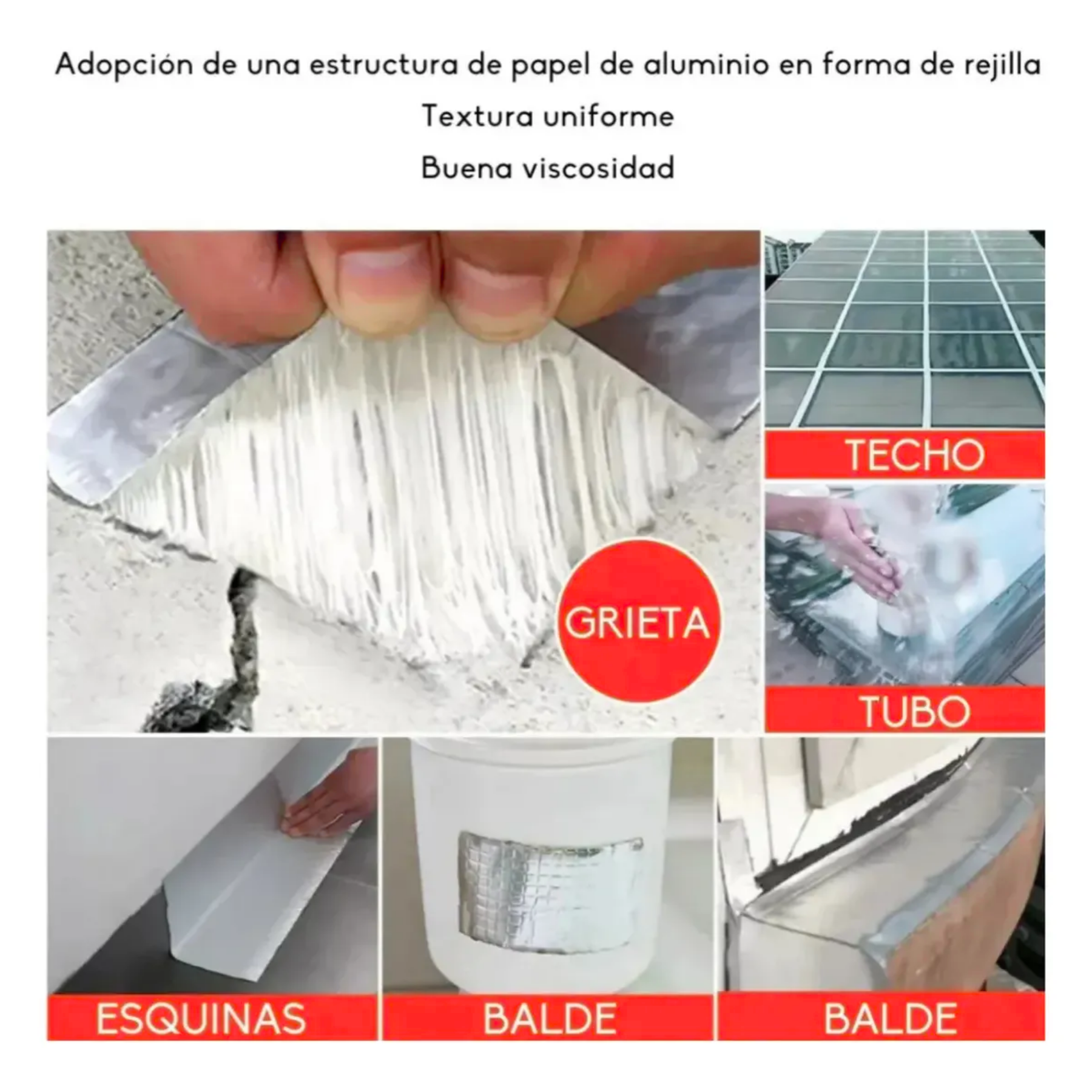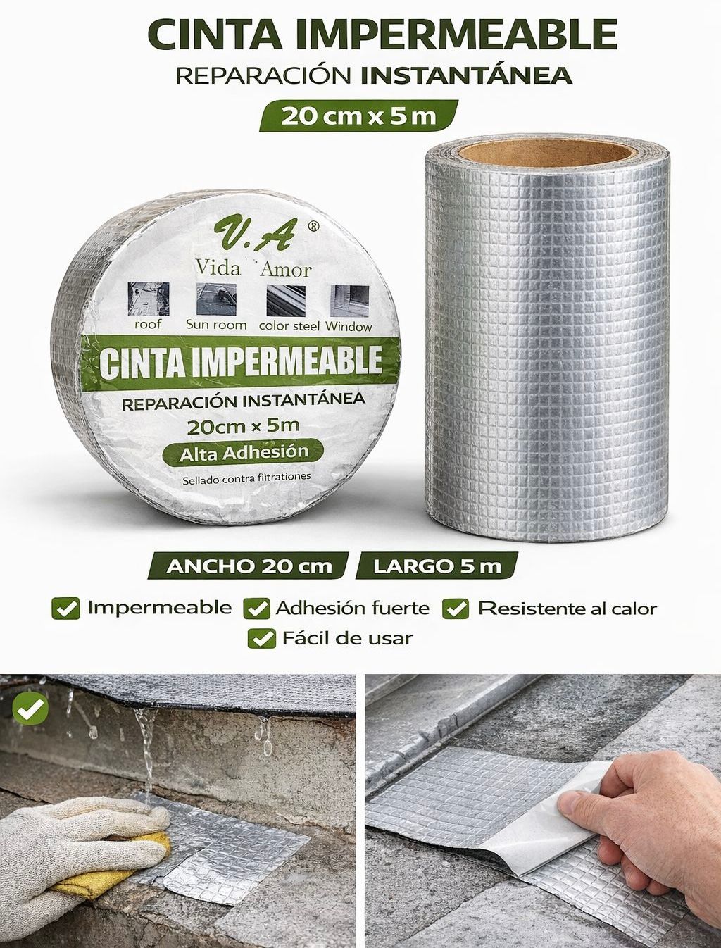 Esta cinta está fabricada con caucho butílico de alto peso molecular mediante un proceso especial. Es una cinta de reparación multiusos, ideal para goteras en techos, sellado de ventanas, toldos para autocaravanas, etc. No es tóxica, no se encoge, es antienvejecimiento y posee excelentes propiedades de sellado, impermeabilidad, resistencia a altas y bajas temperaturas, retardante de llama y aislante.