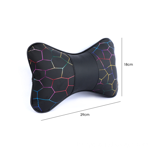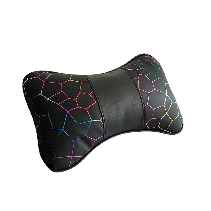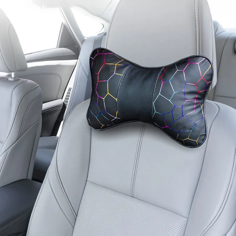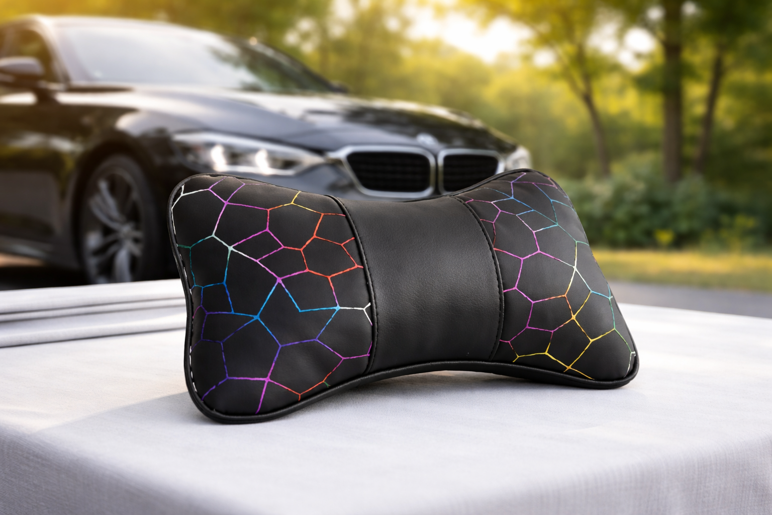 Mejora tu comodidad al conducir con esta almohada apoya cabeza universal, diseñada para brindar soporte ergonómico y un estilo moderno con líneas de colores sobre ecocuero negro.