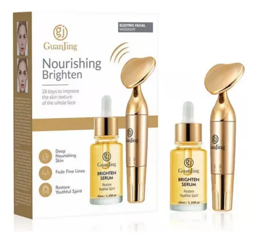 Este set de reparación facial es un tratamiento diseñado para nutrir e iluminar el rostro profundamente en un ciclo de 28 días. El paquete incluye un suero iluminador de 40 ml y un masajeador facial eléctrico que funciona con una batería AA. El suero está formulado con ingredientes como vitamina E y aceite de rosa mosqueta para ayudar a reducir líneas de expresión, unificar el tono de la piel y restaurar su vitalidad juvenil. El masajeador utiliza vibraciones de alta frecuencia que permiten que los nutrientes del suero penetren mejor en los poros, mejorando al mismo tiempo la circulación y relajando los músculos faciales. Es un kit compacto y ligero, ideal para uso diario en casa, que busca mejorar visiblemente la textura y el brillo natural de la piel mediante el uso constante por la mañana y por la noche.